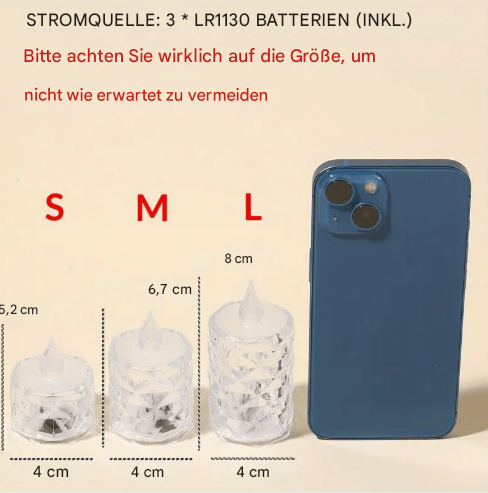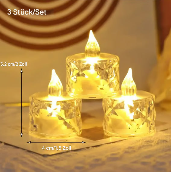 Lieferumfang: 3 x flammenlose Kristallkerzen 3 x Knopfzelle