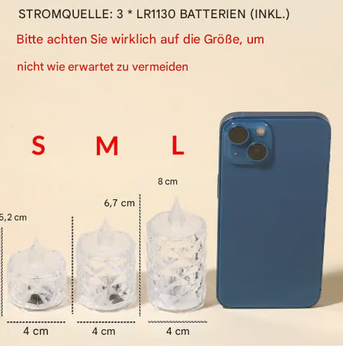 ealistisches Flackern: Dank fortschrittlicher LED-Technologie imitiert die flammenlose Kristallkerze den sanften, flackernden Effekt einer echten Kerze. Das dezente Leuchten wertet die Atmosphäre auf und macht sie perfekt für gemütliche Abende, romantische Abendessen oder festliche Zusammenkünfte.